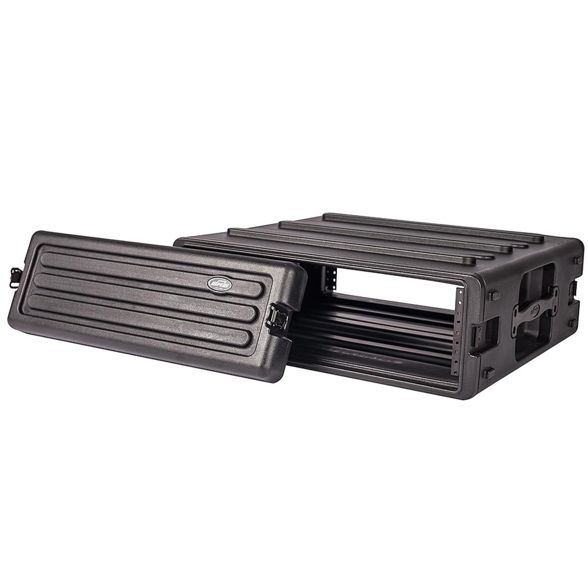 SKB Roto Racks represent the ultimate in American technology with their roto-molded tough shells, front and rear lids, recessed heavy-duty twist latches, molded in handles, and shock absorbing rubber feet for solid stackability. The unique molded-in unbendable valance and steel threaded rails with self tapping screws make the SKB Roto Racks durable and convenient to use.