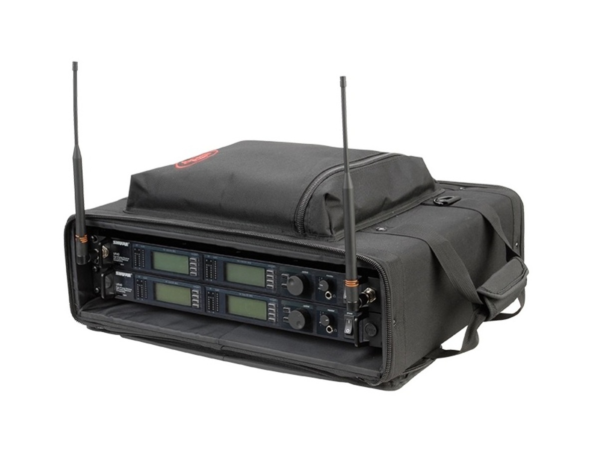 The 1SKB-SC192U, a 2U rack size, is constructed of a wood core covered by 600 Denier Nylon. This soft case has been developed with the focus on portability and includes an adjustable shoulder strap and loop handle for easy transport. The case can be used for transporting testing or smaller rackmounted equipment.The 14.5″ (36.8cm) depth (front rail to back flap) provides plenty of room for the most popular wireless systems.