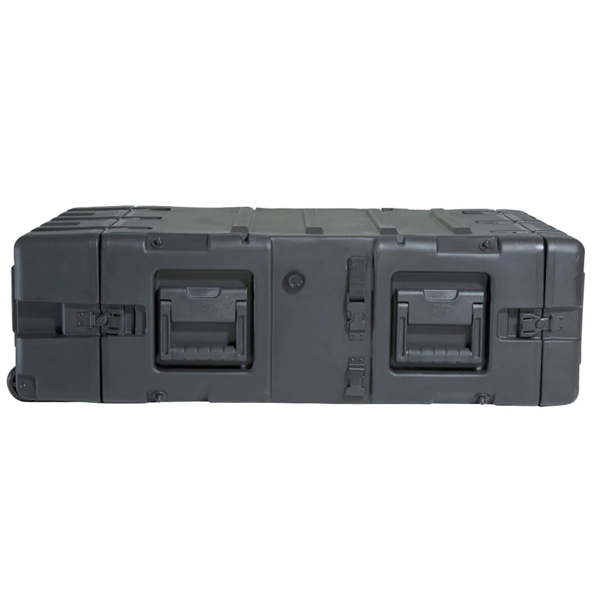 Moulded of LMDP Linear Medium Density Polyethylene plastic that meets or exceed MIL-STD 810G standards and includes 8 elastomeric shock absorbers which allows a standard payload range of 40 to 150 pounds. Optional extended payload range of 160 to 300 pounds can be accommodated as a special order option. The 3RR Series Removable Racks are 24” (610.00mm) deep from rail to rail with a standard 19” rack width per ANSI/EIA-310-C specification and feature square-hole rack rails to accommodate either #10-32 US standard, or 6mm International standard cage nuts which are supplied with the cases.