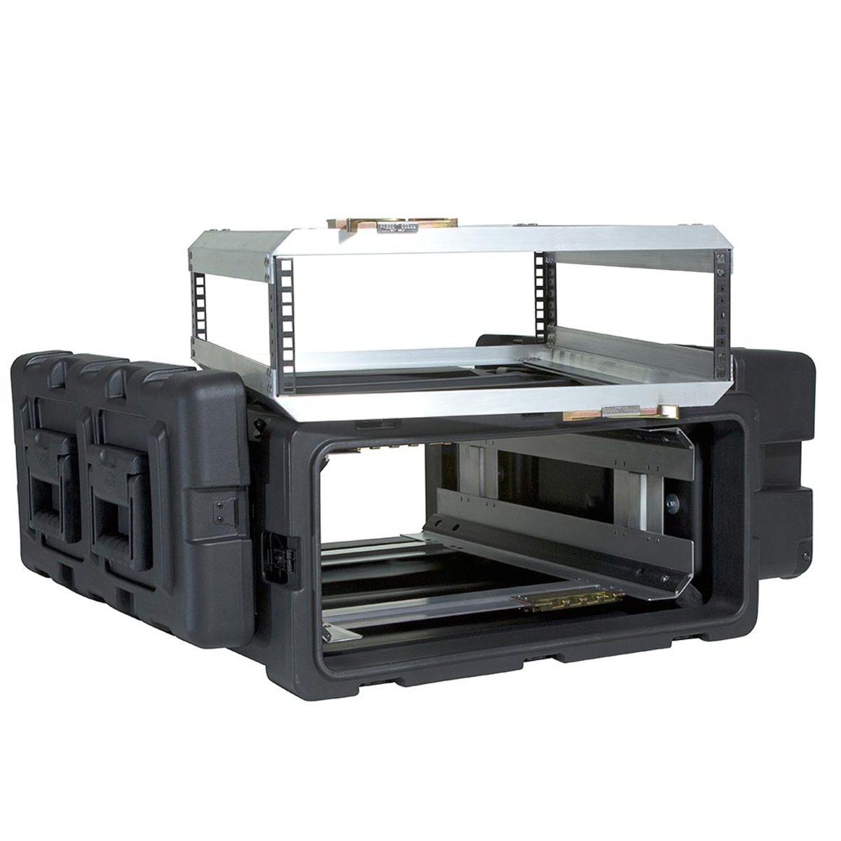 The interior of the case features a removable rack with a patent pending “positive lock” latching system that slides open like a file drawer, allowing full access to racked equipment. The interior rack is also completely removable allowing complete frame access for bench integration.