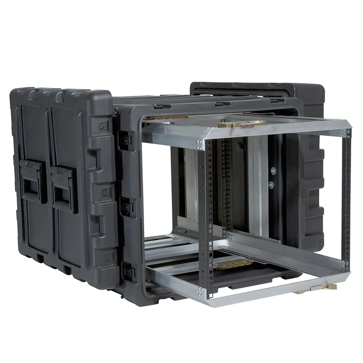 This 9U removable shock mounted rack features a removable rack with a patent pending “positive lock” latching system that slides open like a file drawer, allowing full access to racked equipment. The interior rack is also completely removable allowing complete frame access for bench integration, saving you time and money by eliminating the hassle of dealing with cables and screws in small, limited spaces _ just take the rack out, change the equipment, and slide the rack in again.